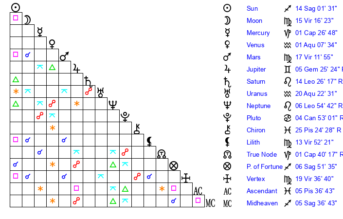 | Mars | 17 Virgo 12 | 23 Sagittarius 32 | 20 Virgo 15 |