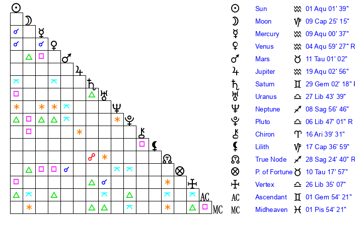 | Jupiter | 18 Aquarius 54 | 11 Gemini 36 | 1 Pisces 1 |