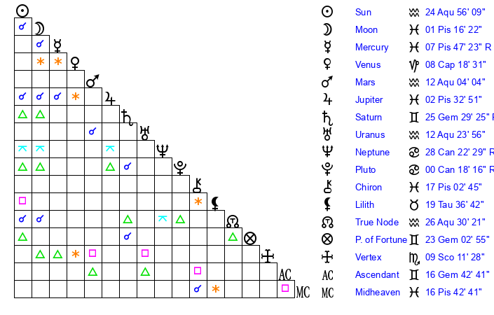 | Sun | 24 Aquarius 56 | 26 Aquarius 15 | 12 Gemini 58 |