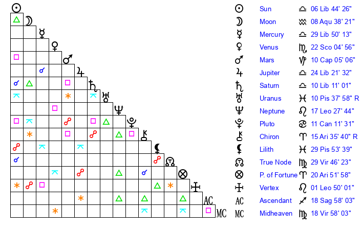 | Mercury | 29 Libra 50 | 20 Libra 43 | 9 Aquarius 15 |