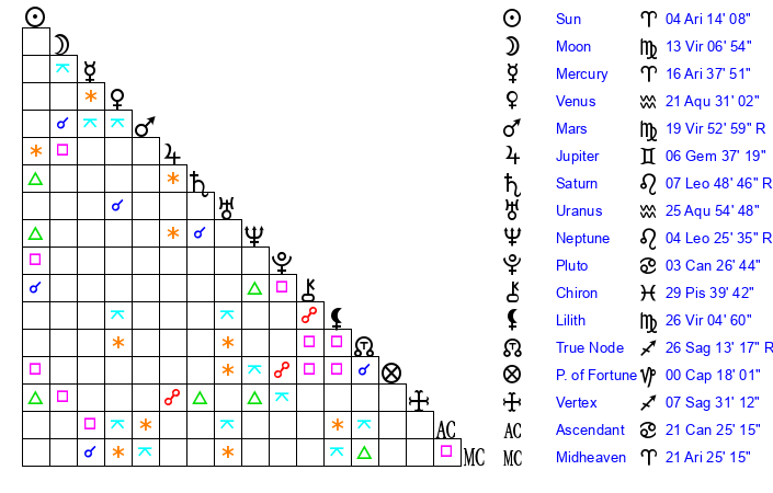 | Mars | 19 Virgo 53 | 21 Cancer 40 | 8 Libra 22 |