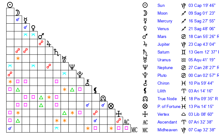 | Mars | 18 Cancer 56 | 7 Capricorn 53 | 22 Cancer 52 |