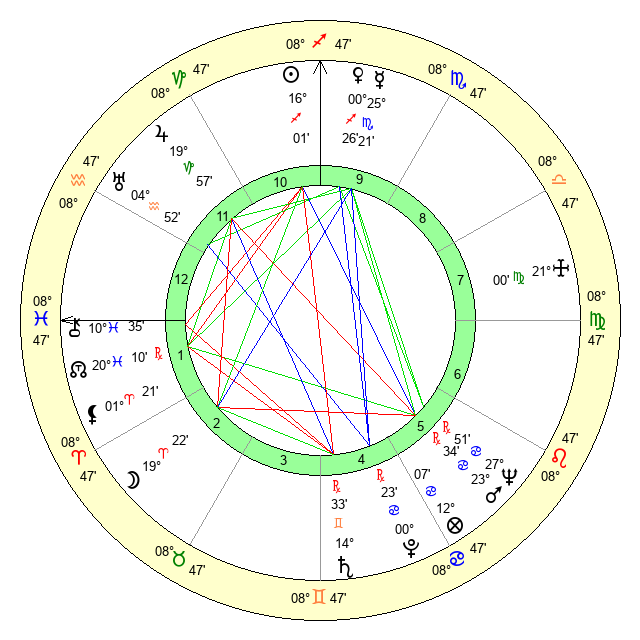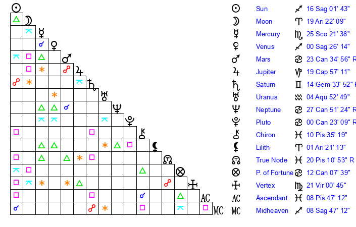 | Venus | 0 Sagittarius 26 | 9 Sagittarius 54 | 20 Aries 44 |