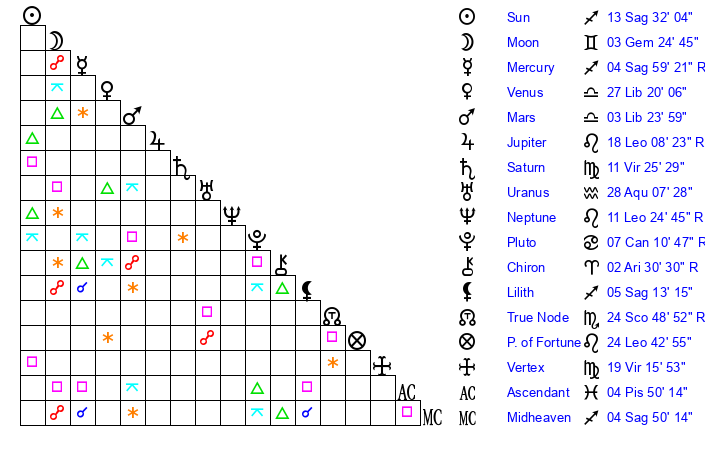 | Sun | 13 Sagittarius 32 | 14 Sagittarius 49 | 0 Aries 47 |