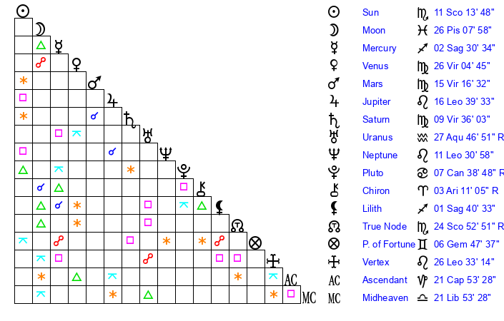 | Sun | 11 Scorpio 13 | 12 Scorpio 32 | 28 Aquarius 45 |
