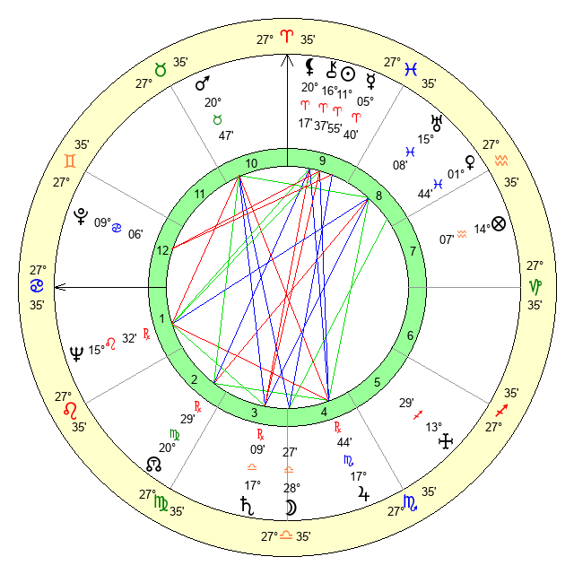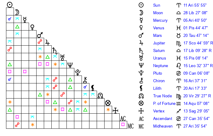 | Moon | 28 Libra 27 | 12 Gemini 27 | 16 Cancer 25 |