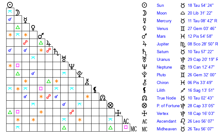 | Sun | 18 Taurus 54 | 20 Taurus 17 | 8 Virgo 7 |