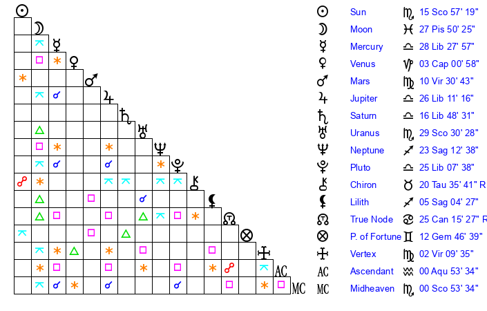 Pluto | 25 Libra 8 | 29 Capricorn 48 | 26 Libra 29 |