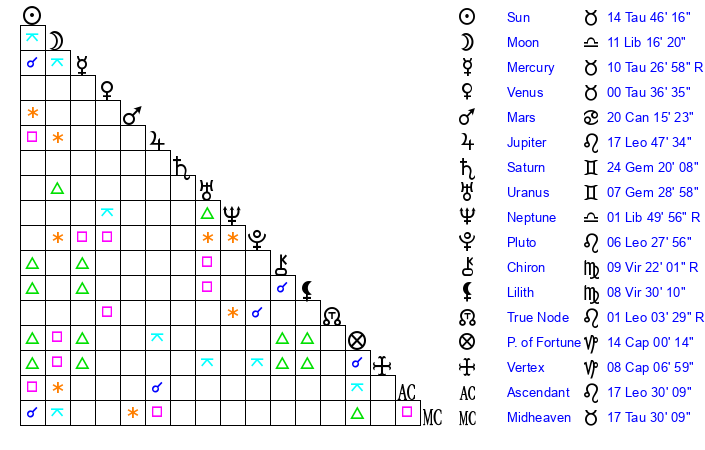| Mars | 5 Gemini 22 | 1 Leo 46 | 27 Gemini 4 |