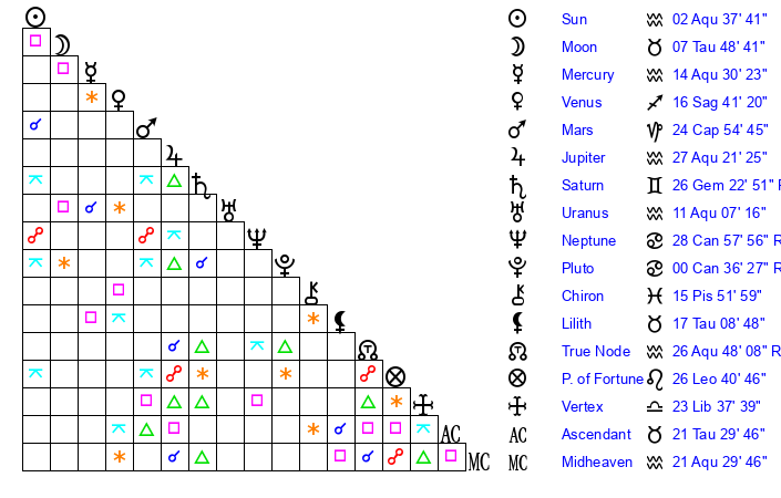 | Sun | 2 Aquarius 37 | 3 Aquarius 57 | 21 Taurus 50 |