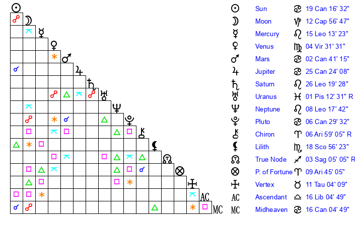 | Moon | 13 Capricorn 3 | 12 Aquarius 59 | 3 Sagittarius 13 |