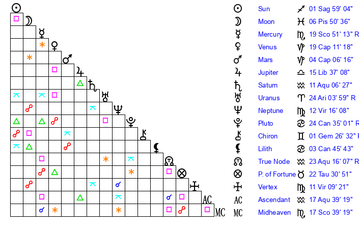 | Saturn | 11 Aquarius 17 | 25 Pisces 4 | 20 Aquarius 56 |