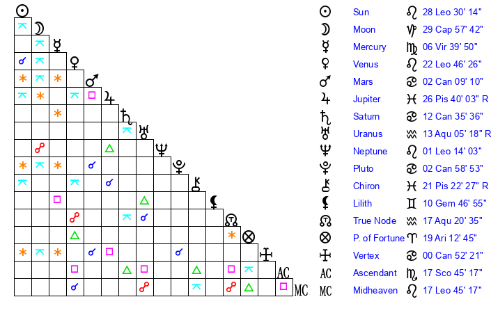 | Moon | 29 Capricorn 54 | 23 Leo 4 | 12 Aquarius 26 |