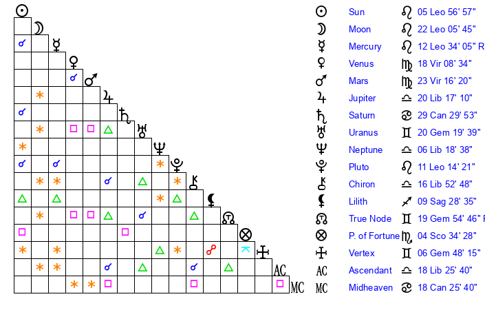 Moon | 22 Leo 7 | 5 Libra 49 | 11 Cancer 25 |
