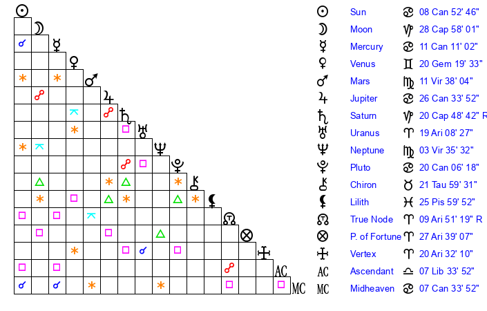| Sun | 8 Cancer 53 | 10 Cancer 6 | 9 Libra 31 |