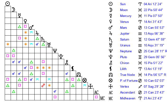 | Moon | 22 Pisces 44 | 14 Aquarius 24 | 14 Aries 45 |