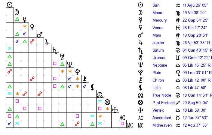 | Neptune | 6 Libra 17 | 27 Pisces 57 | 4 Libra 22 |