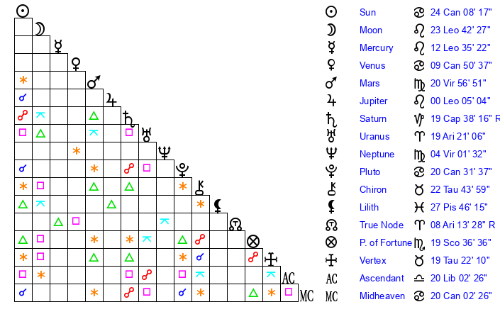| Sun | 24 Cancer 8 | 25 Cancer 22 | 25 Libra 21 |