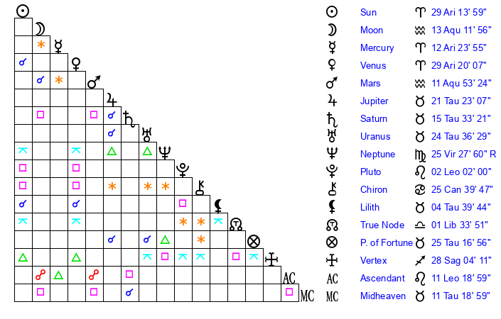 | Saturn | 15 Taurus 44 | 26 Pisces 34 | 25 Taurus 46 |