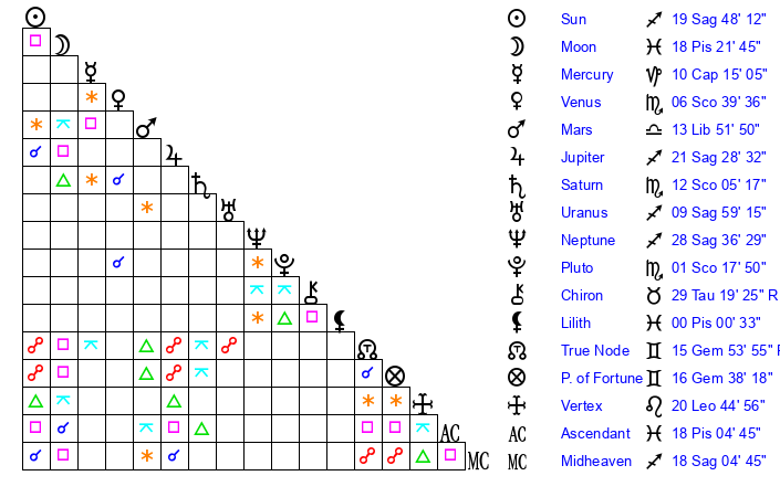 Moon | 18 Pisces 22 | 11 Taurus 7 | 24 Virgo 50 |