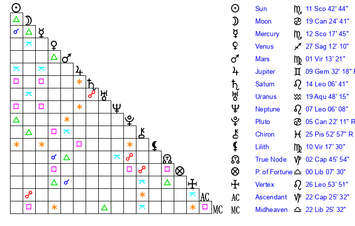 | Mercury | 12 Scorpio 18 | 5 Sagittarius 12 | 15 Aquarius 38 |
