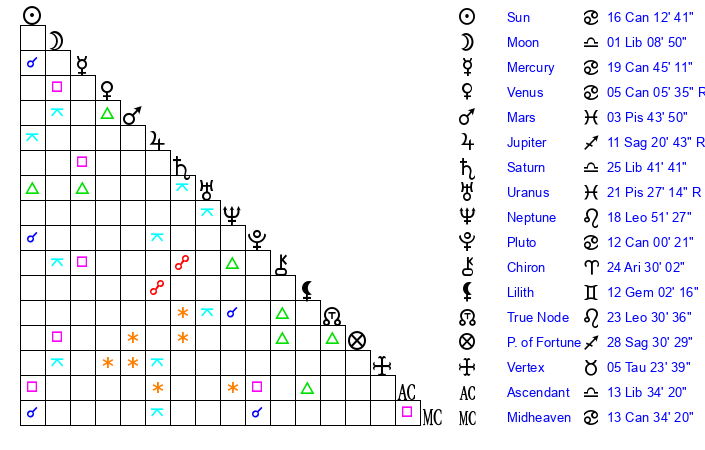 | Moon | 1 Libra 7 | 21 Sagittarius 46 | 18 Gemini 49 |