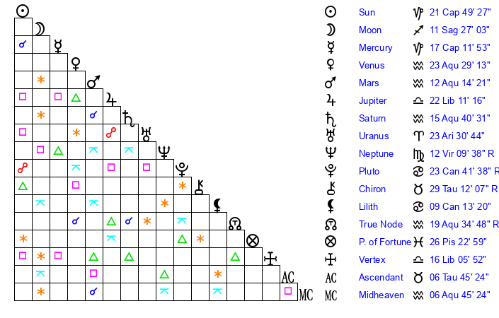 | Saturn | 15 Aquarius 50 | 15 Pisces 26 | 25 Aquarius 53 |