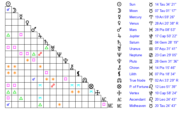 | Moon | 7 Taurus 6 | 28 Leo 42 | 9 Gemini 56 |