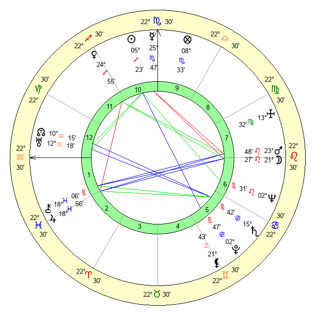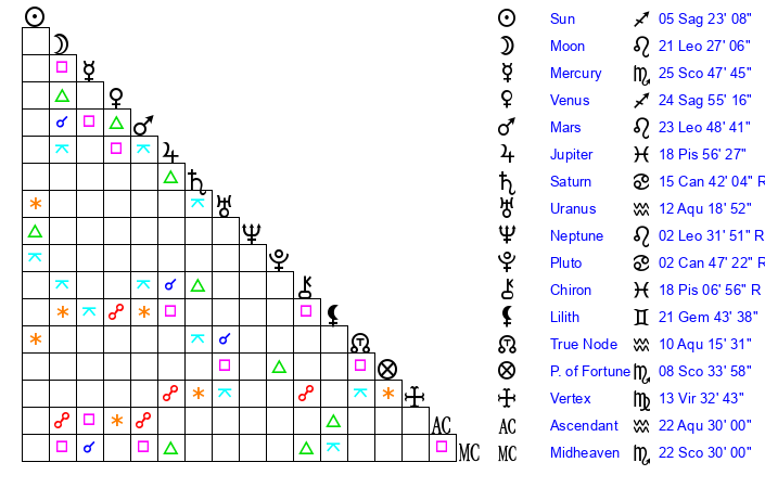 | Moon | 21 Leo 24 | 11 Pisces 51 | 2 Virgo 32 |