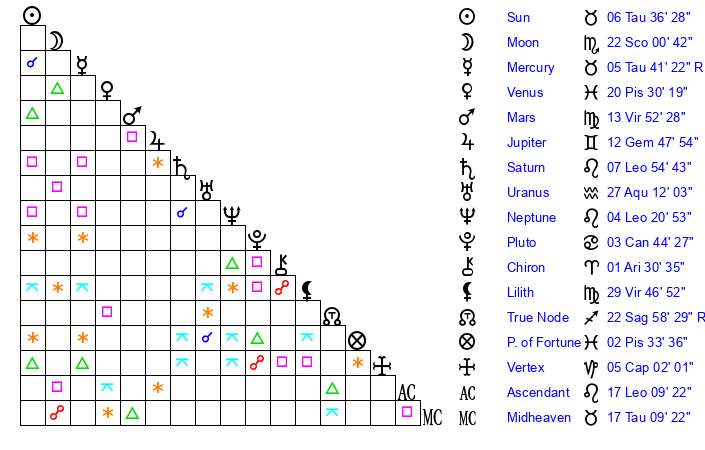 | Moon | 22 Scorpio 6 | 6 Taurus 15 | 24 Libra 24 |