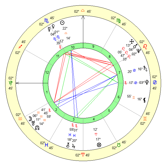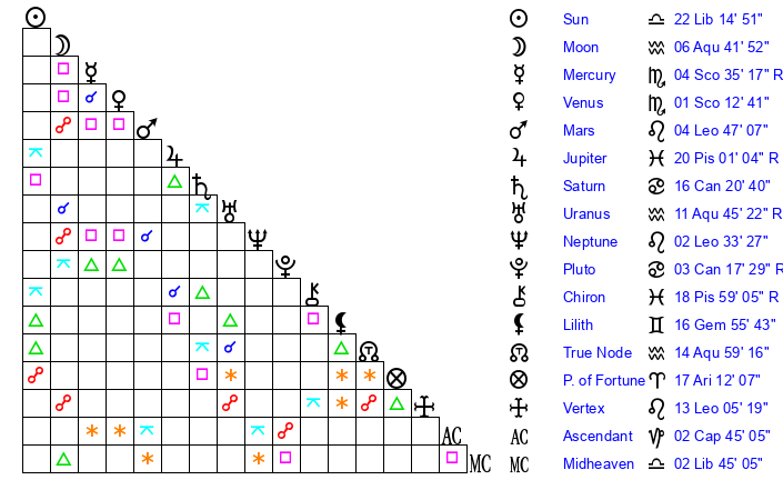 | Sun | 22 Libra 14 | 23 Libra 35 | 13 Aquarius 33 |