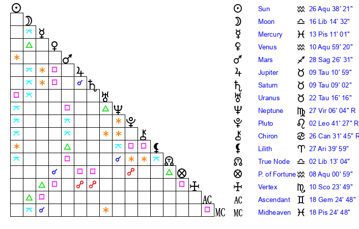 | Sun | 26 Aquarius 38 | 27 Aquarius 16 | 19 Taurus 37 |
