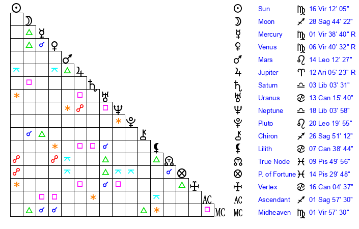 Sun | 16 Virgo 12 | 17 Virgo 16 | 29 Scorpio 35 |