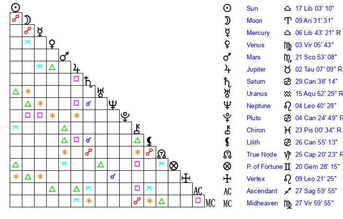 | Sun | 17 Libra 3 | 17 Libra 38 | 7 Aquarius 13 |