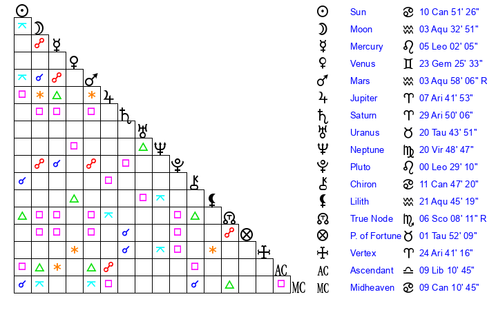 | Sun | 10 Cancer 51 | 12 Cancer 1 | 3 Libra 41 |