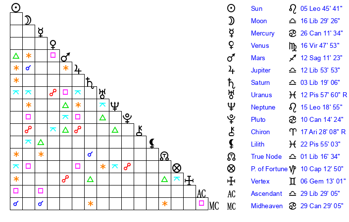 | Moon | 16 Libra 29 | 5 Libra 49 | 13 Cancer 50 |