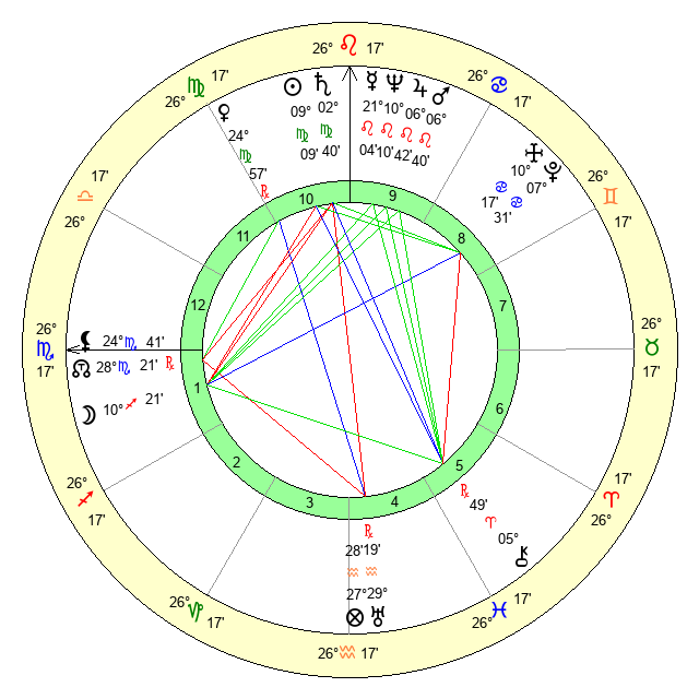 | Mars | 6 Leo 41 | 17 Libra 2 | 9 Libra 16 |