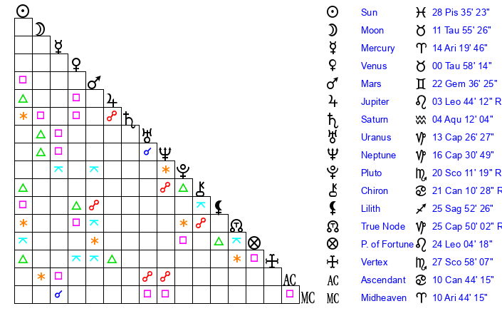 | Moon | 11 Taurus 56 | 28 Scorpio 12 | 17 Leo 19 |