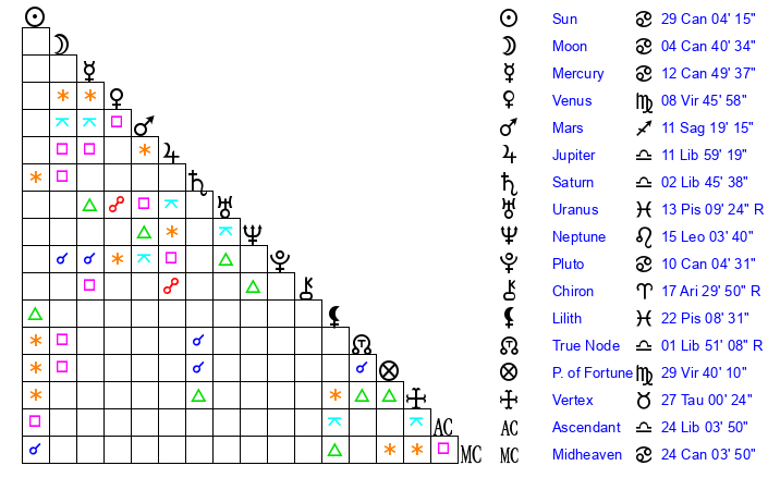 | Mercury | 12 Cancer 50 | 14 Leo 45 | 21 Libra 18 |