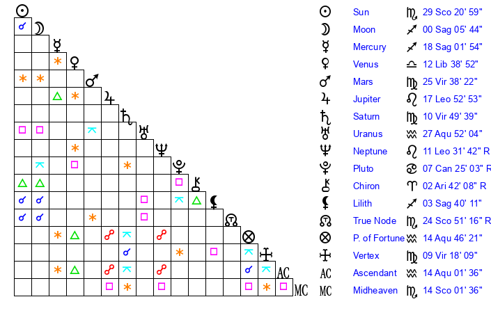 | Sun | 29 Scorpio 21 | 0 Sagittarius 39 | 16 Pisces 50 |