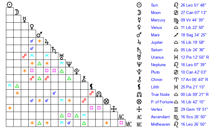 | Sun | 26 Leo 52 | 27 Leo 55 | 8 Sagittarius 44 |