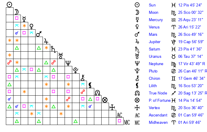 | Sun | 12 Pisces 45 | 13 Pisces 24 | 8 Gemini 52 |