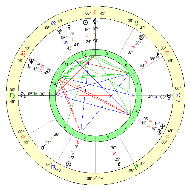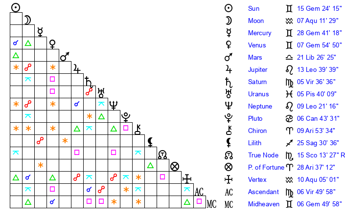 | Sun | 15 Gemini 24 | 16 Gemini 0 | 26 Virgo 11 |