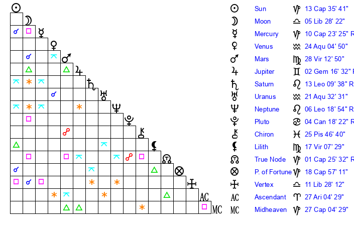 | Moon | 5 Libra 24 | 15 Pisces 22 | 10 Virgo 27 |
