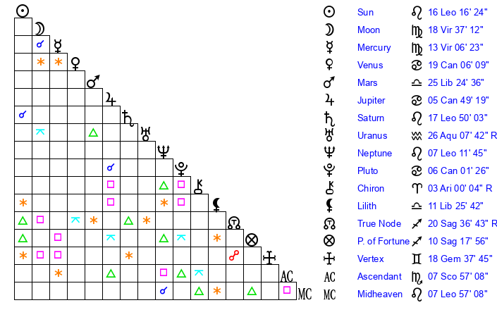 | Moon | 18 Virgo 39 | 22 Aquarius 9 | 23 Leo 23 |