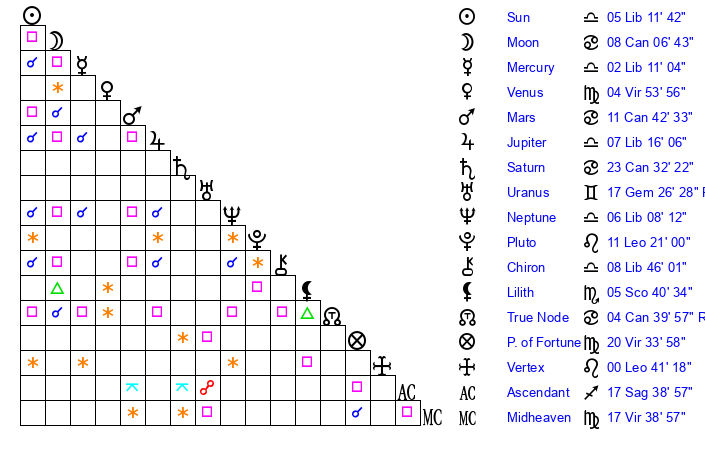 | Neptune | 6 Libra 9 | 0 Aries 36 | 8 Libra 28 |