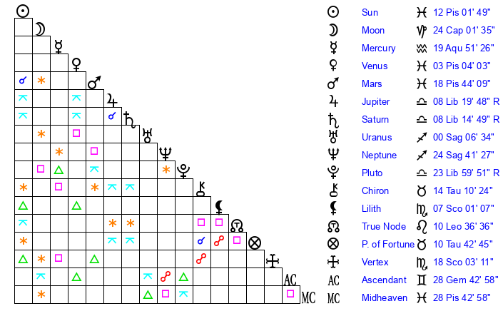 Sun | 12 Pisces 2 | 12 Pisces 22 | 25 Aries 38 |