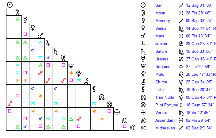 | Saturn | 16 Scorpio 1 | 25 Pisces 6 | 21 Scorpio 27 |