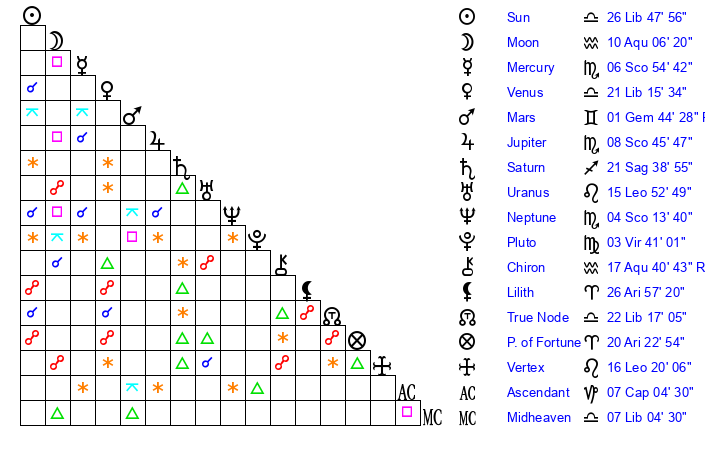 | Moon | 10 Aquarius 13 | 18 Libra 34 | 10 Cancer 50 |