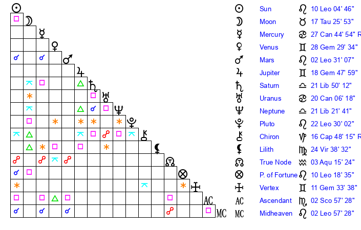 | Pluto | 22 Leo 30 | 2 Aquarius 22 | 24 Leo 33 |